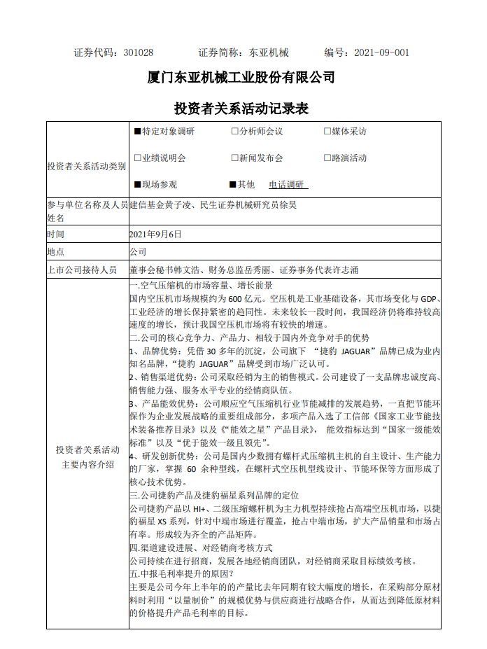 2021年9月6日投資者關(guān)系活動記錄表