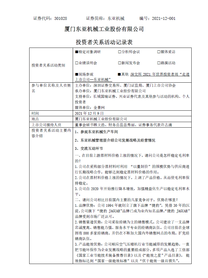 2021年12月9日投資者關(guān)系活動記錄表