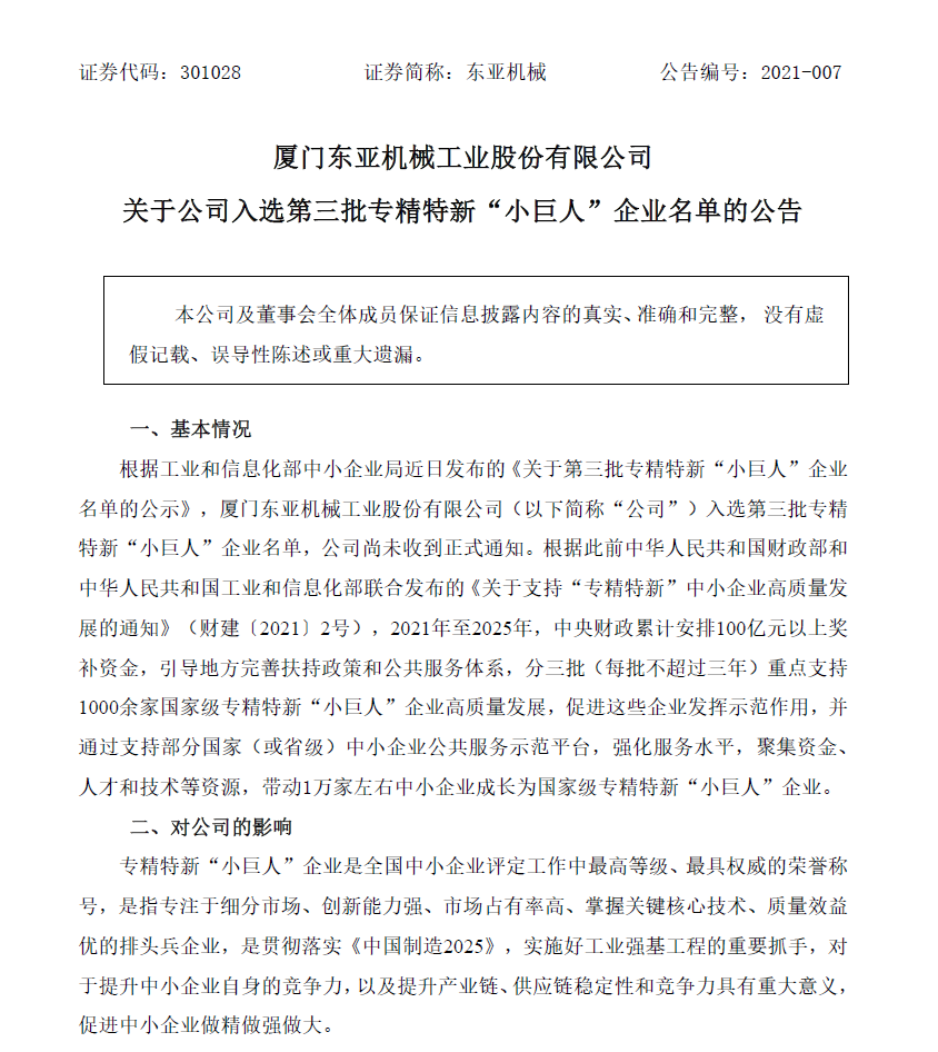 關(guān)于公司入選第三批專精特新“小巨人”企業(yè)名單的公告