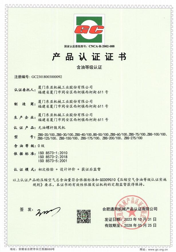 我司無油機全系列均已通過合肥通用所檢測驗證認證,符合ISO 8573標準,實現(xiàn)Class 0 無油認證。