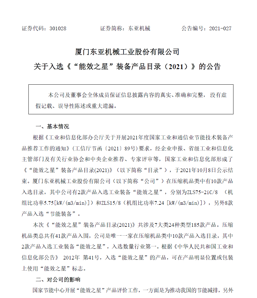 關(guān)于入選《“能效之星”裝備產(chǎn)品目錄(2021)》的公告