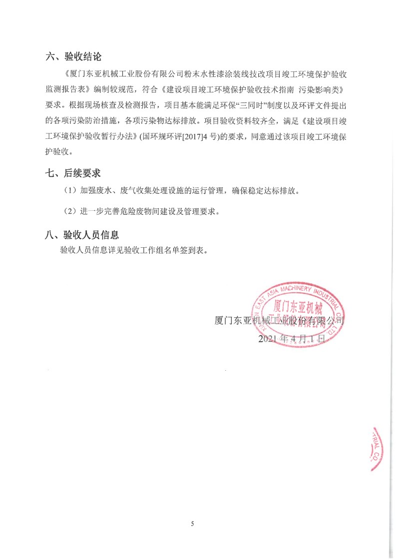 廈門東亞機械工業(yè)股份有限公司粉末水性涂裝線技術(shù)改造項目(噴粉線部分)竣工環(huán)境驗收意見